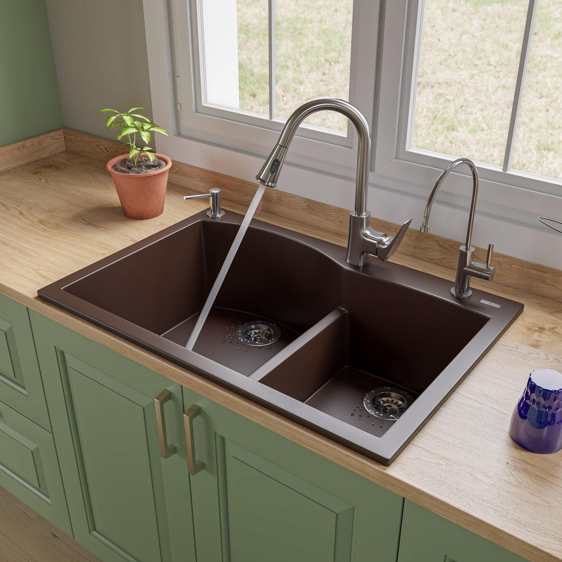 ALFI brand AB3320DI-C Chocolate 33" Double Bowl Drop In Granite Composite Kitchen Sink
