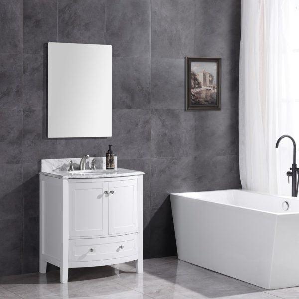 Features:18mm White Carrara Marble TopWhite Ceramic Sink3 pre-drilled faucet hole, 8" spread2 doors, 1 tilt-out...