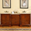 Introducing our 87-inch Transitional Walnut Double Sink Bathroom Vanity, a majestic piece that combines classic design with modern functionality. The rich walnut finish provides a warm, inviting tone, while the Crema Marfil Marble countertop with an elegant Ogee edge profile offers luxurious sophistication. Two white ceramic undermount sinks lie at the heart of this expansive vanity, each pre-drilled for an 8" widespread faucet to provide a seamless blend of style and convenience.