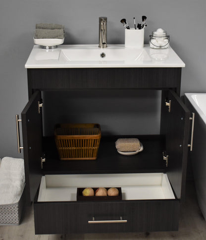 Quality-crafted and made in the USA, the Pacific collection features a ceramic porcelain integrated countertop pre-drilled for a single-hole faucet mount. Built for extra durability and low maintenance, the cabinet’s clean lines and a sophisticated profile are accentuated with a premium manufactured wood frame, soft-close glides and hinges, click-to-release drawers, and full-size hardware. You have plenty of storage space with one large cabinet area and one bottom drawer. A perfect choice for your renovation, the Pacific will fit your bathroom’s modern design and create a fresh look for your home.