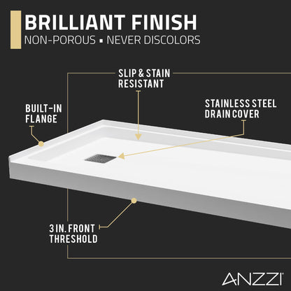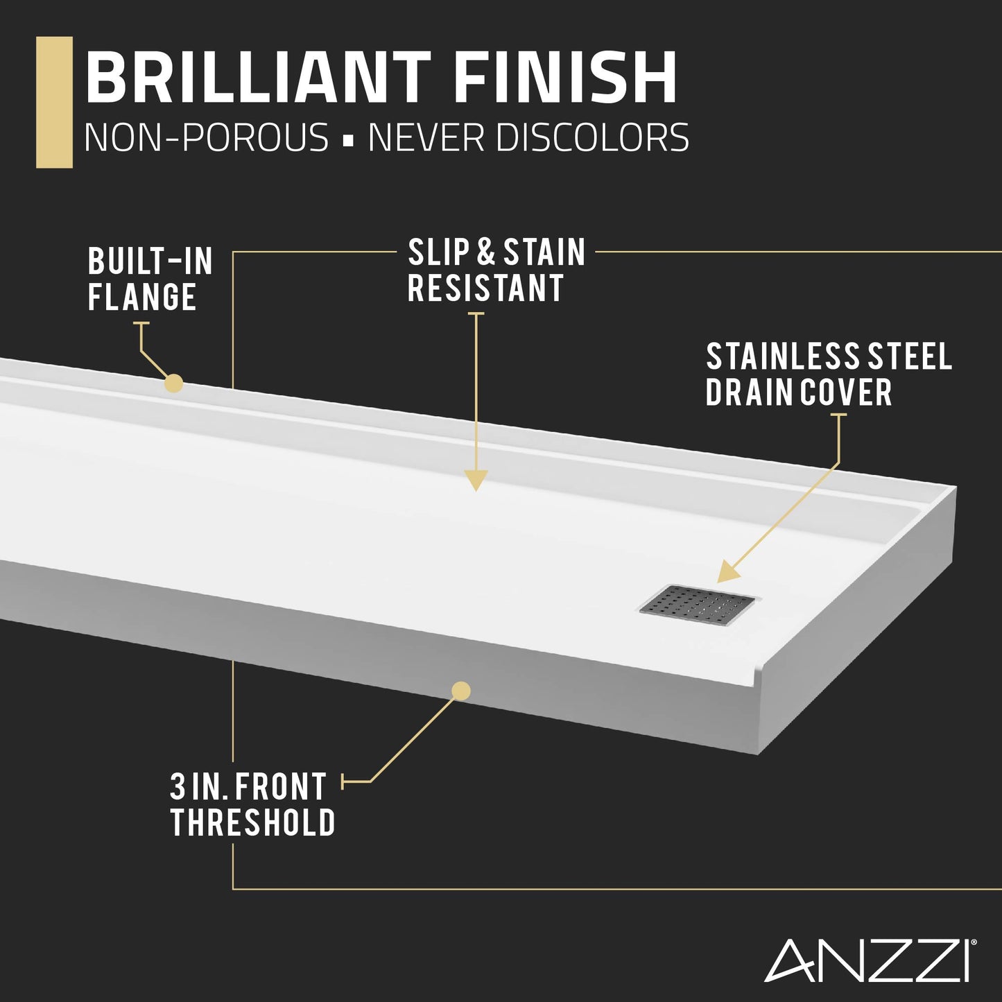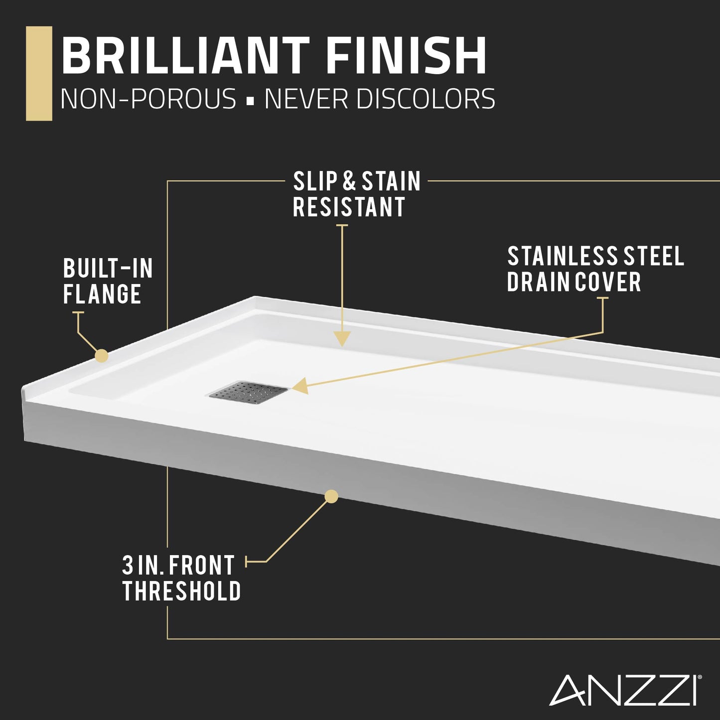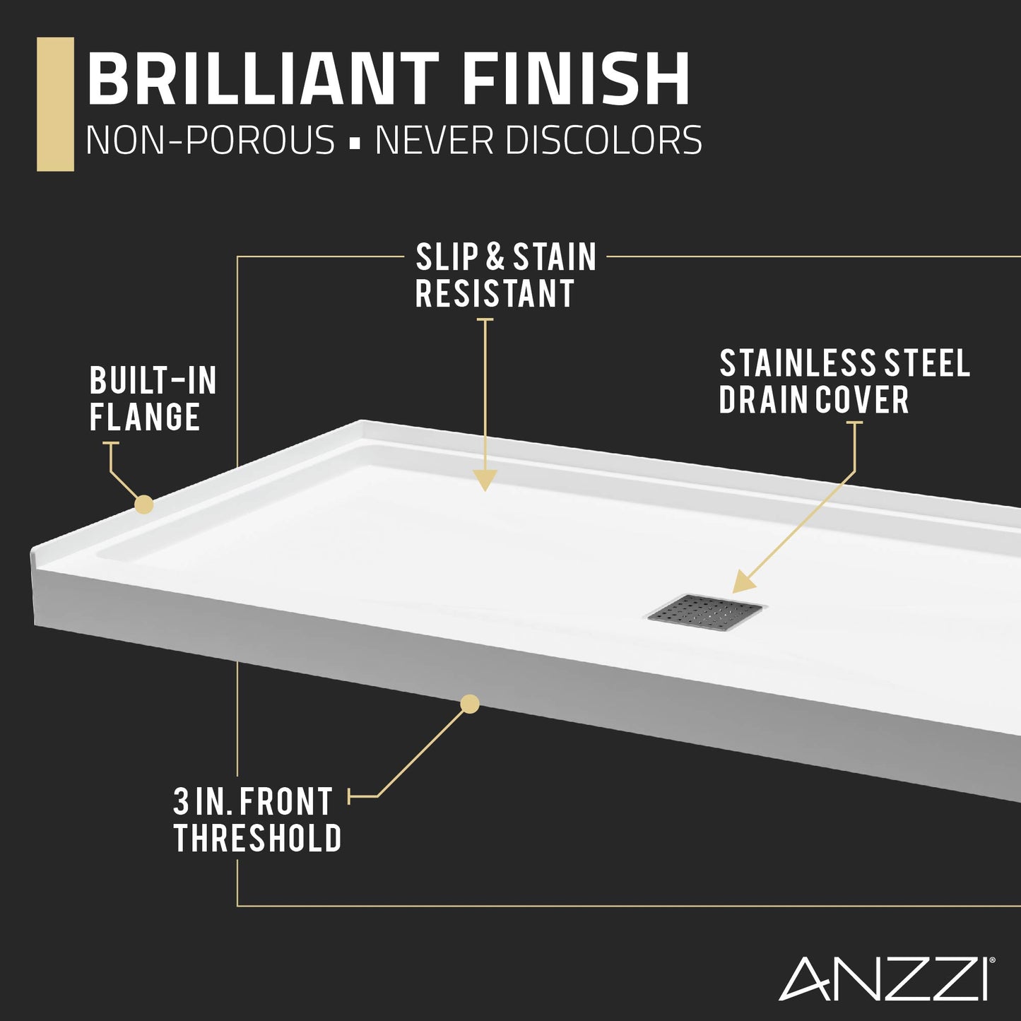 The perfect shower space starts with this stylish, sturdy base from ANZZI. We crafted it from premium ANR material, a super-durable blend of resin, fiberglass and stone filler that’s stronger and lighter than both artificial stone and acrylic. The specially textured, slip-resistant floor surface gives you safe and secure footing so you can shower with confidence, while the moisture resistant construction protects against mold, mildew and odor.