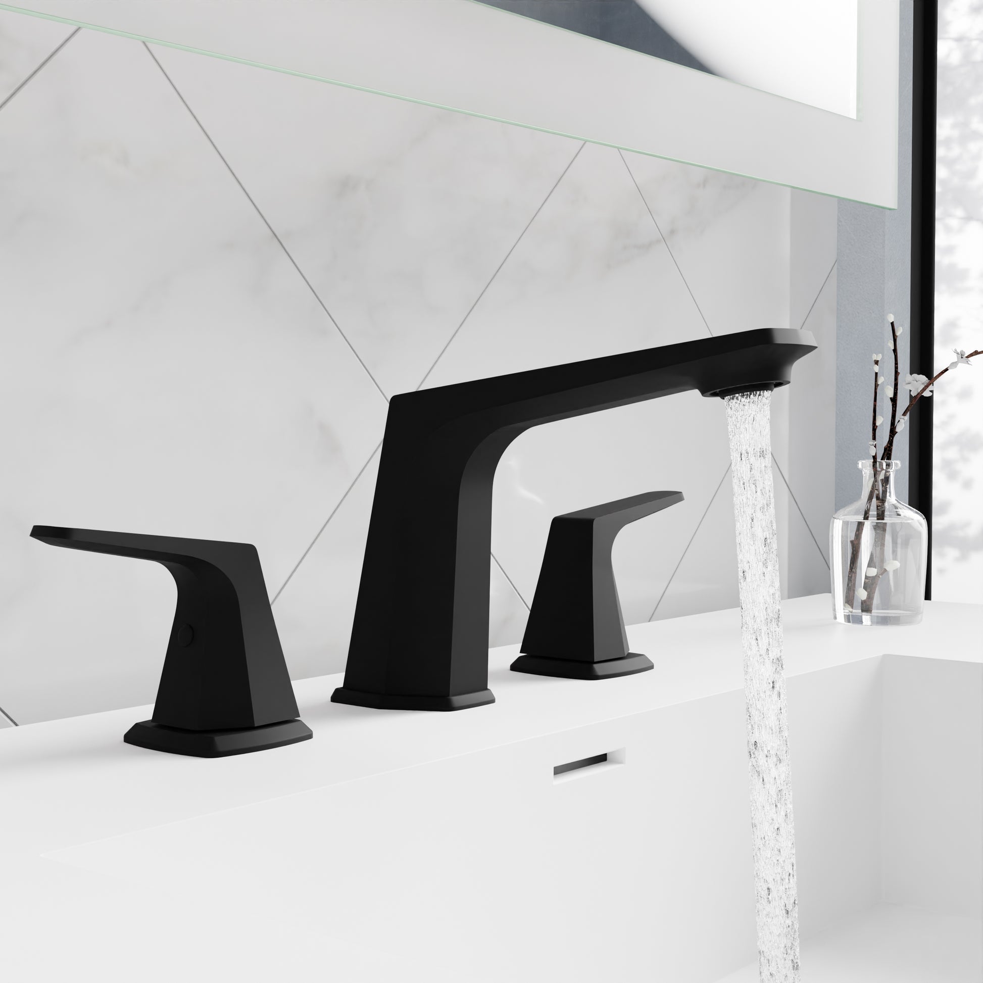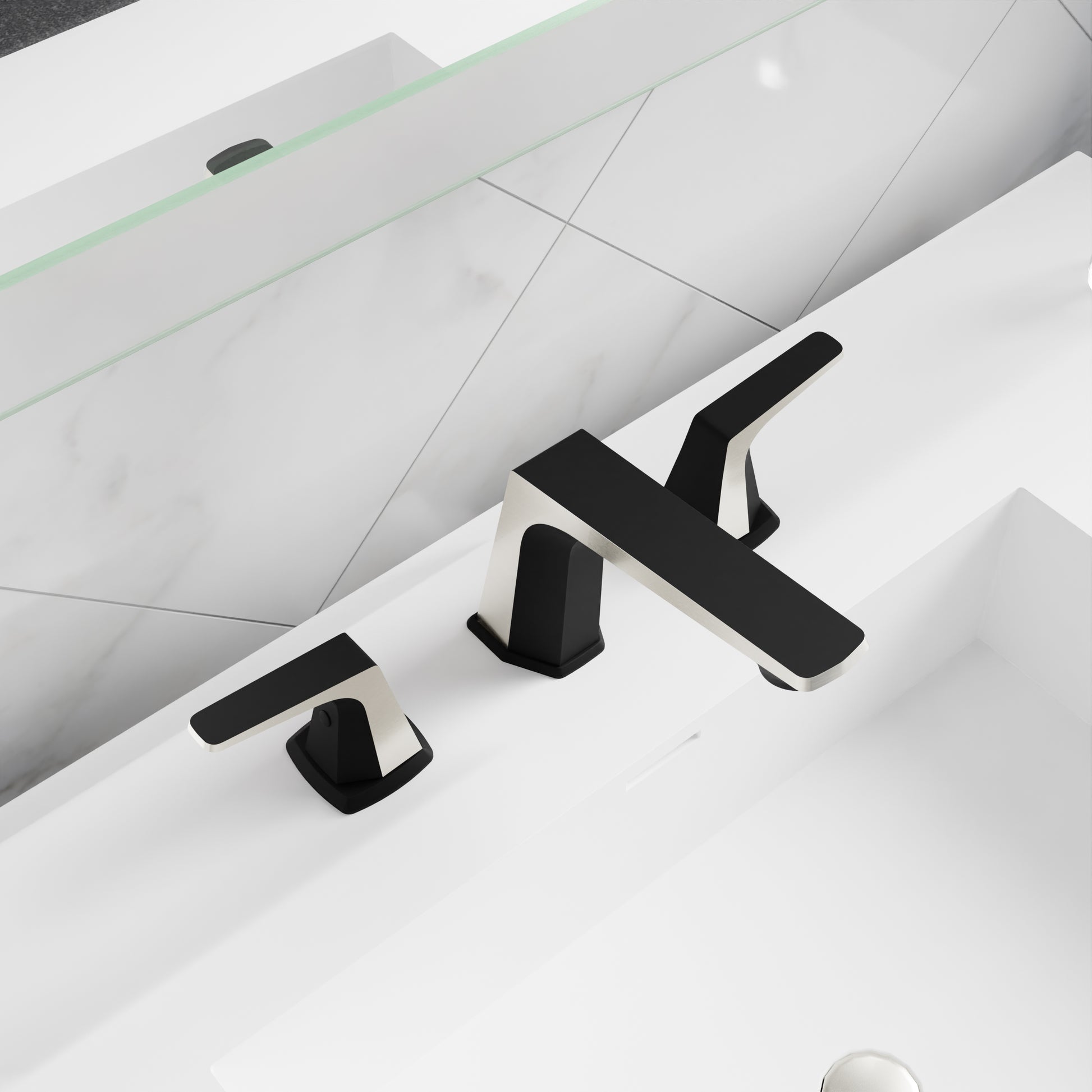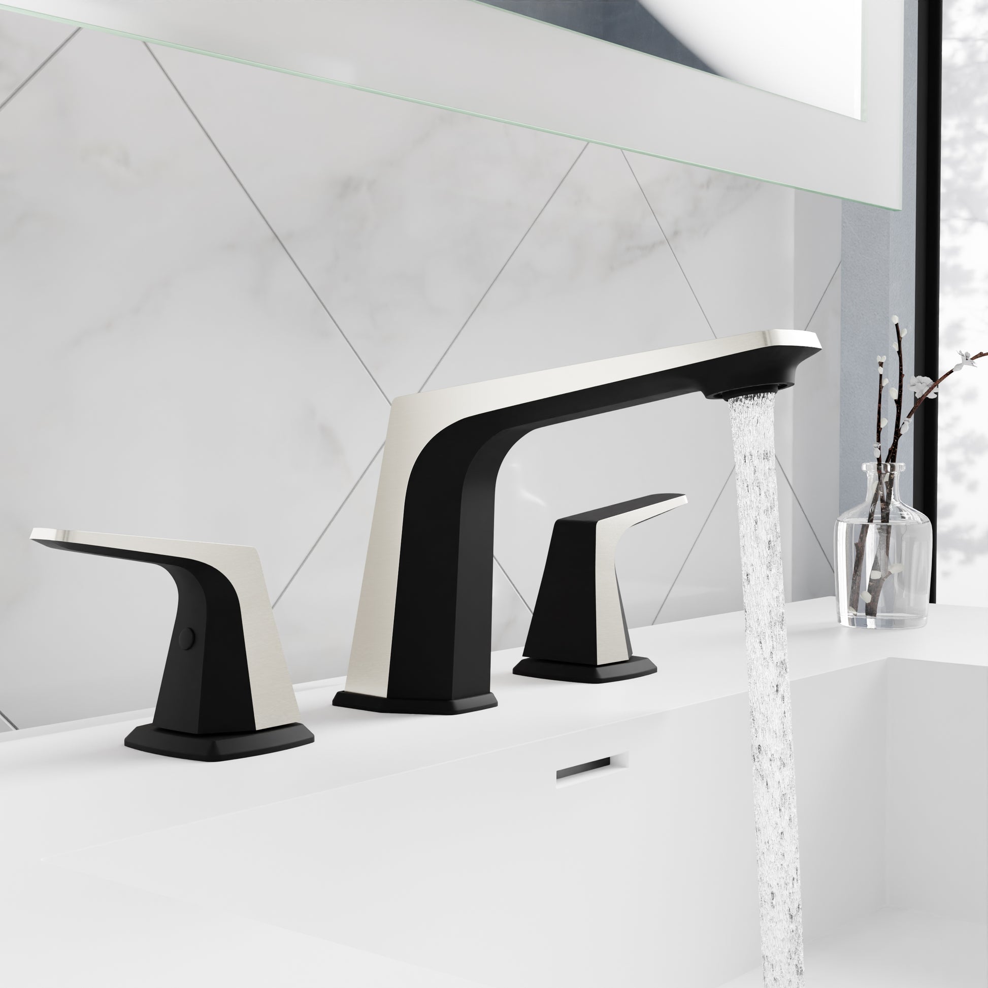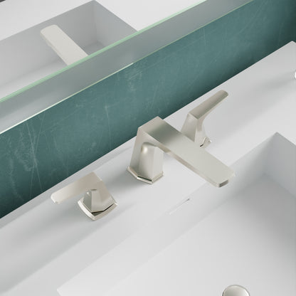 Sculpted from sleek lines and edgy angles, this faucet adds the contemporary touch your bathroom needs. The modern, minimalist styling looks clean and uncluttered when matched to any sink. Streamlined handles for hot and cold give precise control of water volume and temperature so you can adjust to your exact preference. The 1.2 gpm rate minimizes water usage while still delivering a strong flow. Durable brass construction is finished in a brilliant Brushed Nickel.