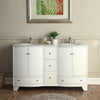 Enhance your bathroom with the Silkroad Exclusive 60-inch Vanity, an exemplar of transitional design. This double sink vanity, set in a clean white finish, is topped with a Carrara white marble countertop with a sophisticated ogee edge. Two undermount oval sinks crafted from pristine white ceramic are pre-drilled for 8" widespread faucets and accented with brushed nickel hardware, marrying classic elegance with modern flair. The vanity stands on the floor as a freestanding unit, built from natural stone and solid wood with TSCA Title VI-certified panels. It features five spacious drawers with soft-close slides and four doors, providing ample and quiet storage solutions for a serene bathroom environment.