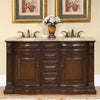 This Traditional 60-inch Vanity brings a touch of classic elegance to your bathroom. Crafted with a solid wood structure in an American walnut finish, it features a luxurious travertine countertop with a graceful ogee edge. Two ivory ceramic under-mount sinks, pre-drilled for 8" widespread faucets, sit regally atop the vanity. The piece is adorned with antique brass finish hardware, adding to its timeless appeal. Six spacious drawers and two doors provide ample storage, all equipped with soft-close slides for a seamless experience. Designed for freestanding floor placement, this vanity not only meets the needs of daily use but also enhances your space with its distinguished traditional style.