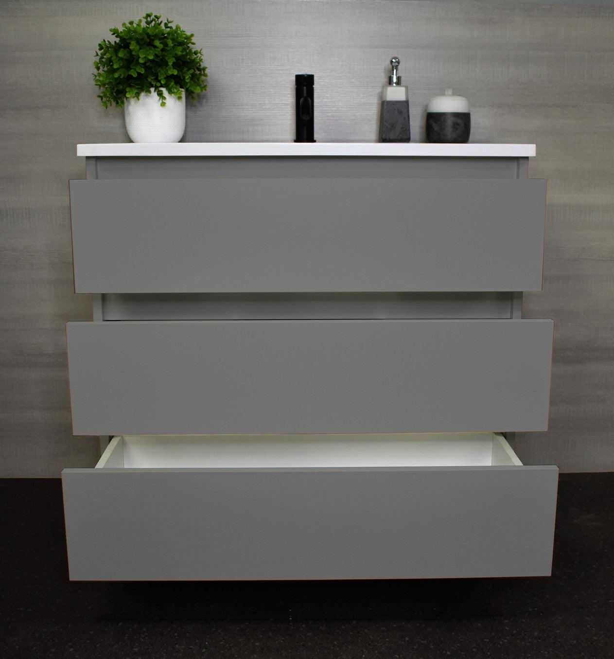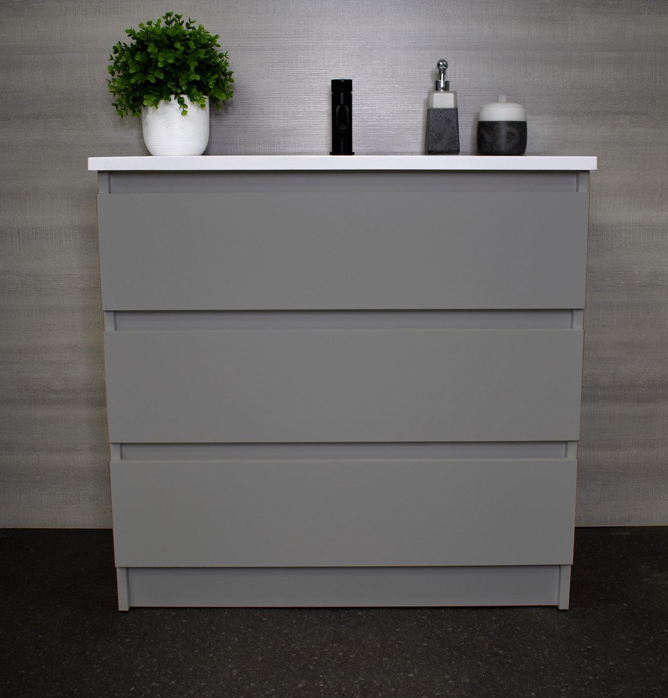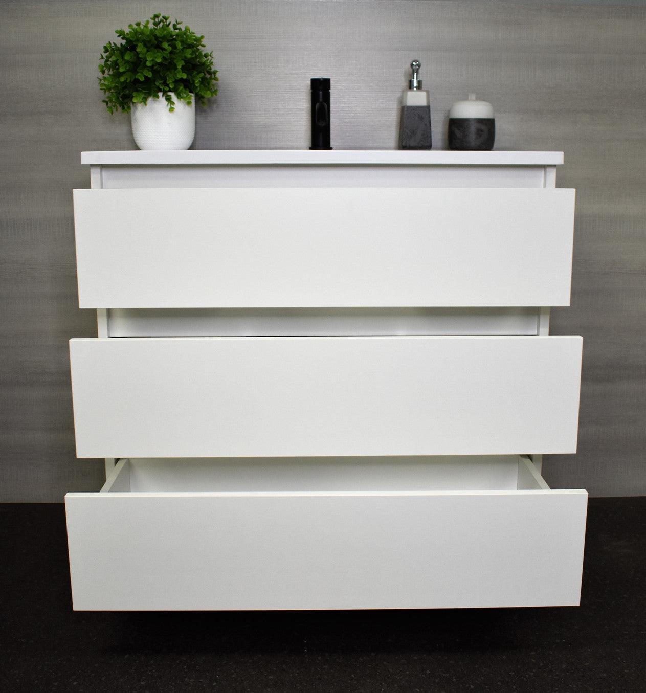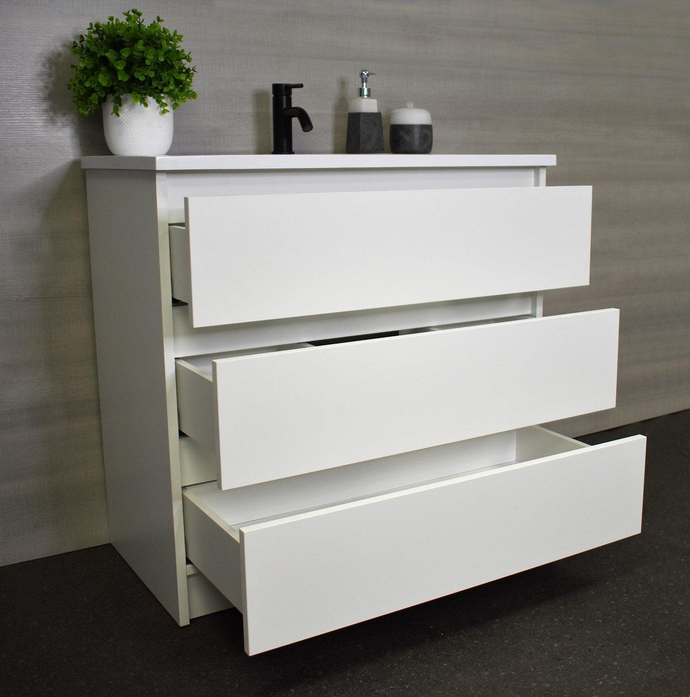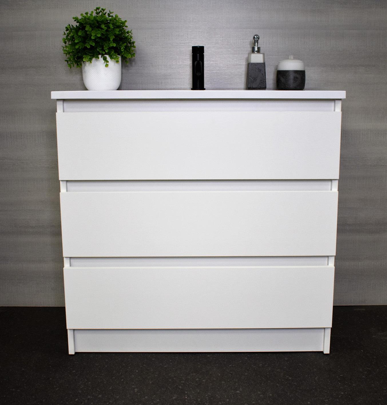 Quality-crafted and proudly made in the USA, the Pepper vanity collection features an acrylic integrated countertop pre-drilled for a single hole faucet mount. Built for extra durability and low maintenance, the cabinet’s clean lines and sophisticated profile are accentuated with a premium Canadian manufactured wood frame and soft-close glides. You have plenty of storage space with three drawers and five compartments. The top and middle drawers maximize storage space by concealing four usable compartments. A perfect choice for your renovation, the Pepper will fit your bathroom’s modern design and create a fresh look for your home.